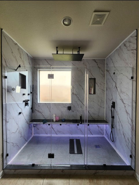 A collection of images showcasing modern bathrooms with tiled walls, bathtub, and hexagonal tile accents.